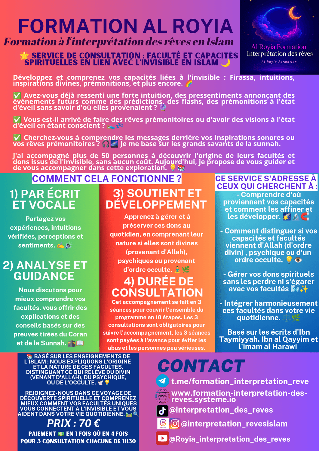 Développez et comprenez vos capacités liées à l'invisible : Firassa (perspicacité miraculeuse), fortes intuitions, inspirations divines, prémonitions, et plus encore.